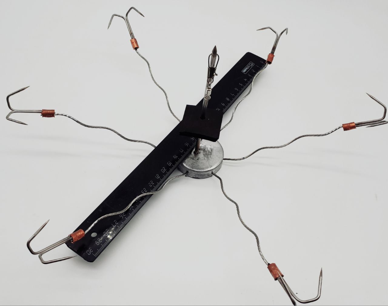 8) Так же краболовка оснащена чёрным квадратом из резины для прижатия наживы на штыре и мощным карабином для крепления краболовки к лески