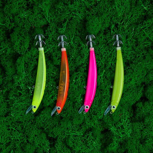 ПОДБОР СНАСТЕЙ ЗАДАТЬ ВОПРОСНабор из 4 кальмарных воблеров, оснащенных японскими крючками.