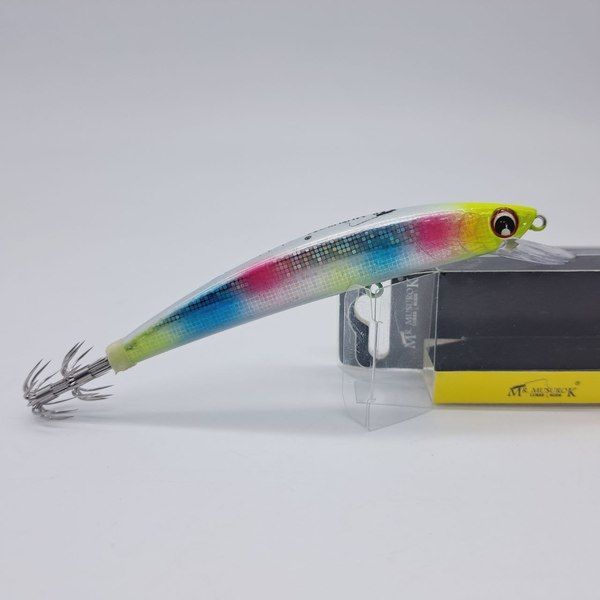Кальмарный воблер, оснащён японскими крючками. Внутри наших воблеров располагаются шарики, наделяющие приманку активной игрой даже при обычной (равномерной) проводке. Игра максимально имитирует движение рыбки. Так же данные шарики создают шумовой эффект, для привлечения кальмаров с дальних дистанций.