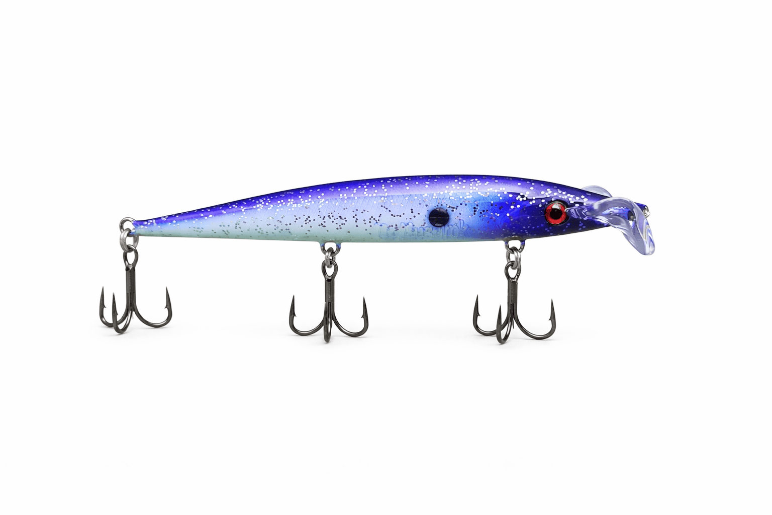 Воблер мы изготовили из высококачественного ABC пластика, а тройники закрепили на цельной проволоке из нержавеющей стали, проходящей через весь корпус. Рыба не сможет вырвать крепление даже при экстремальной нагрузке.
