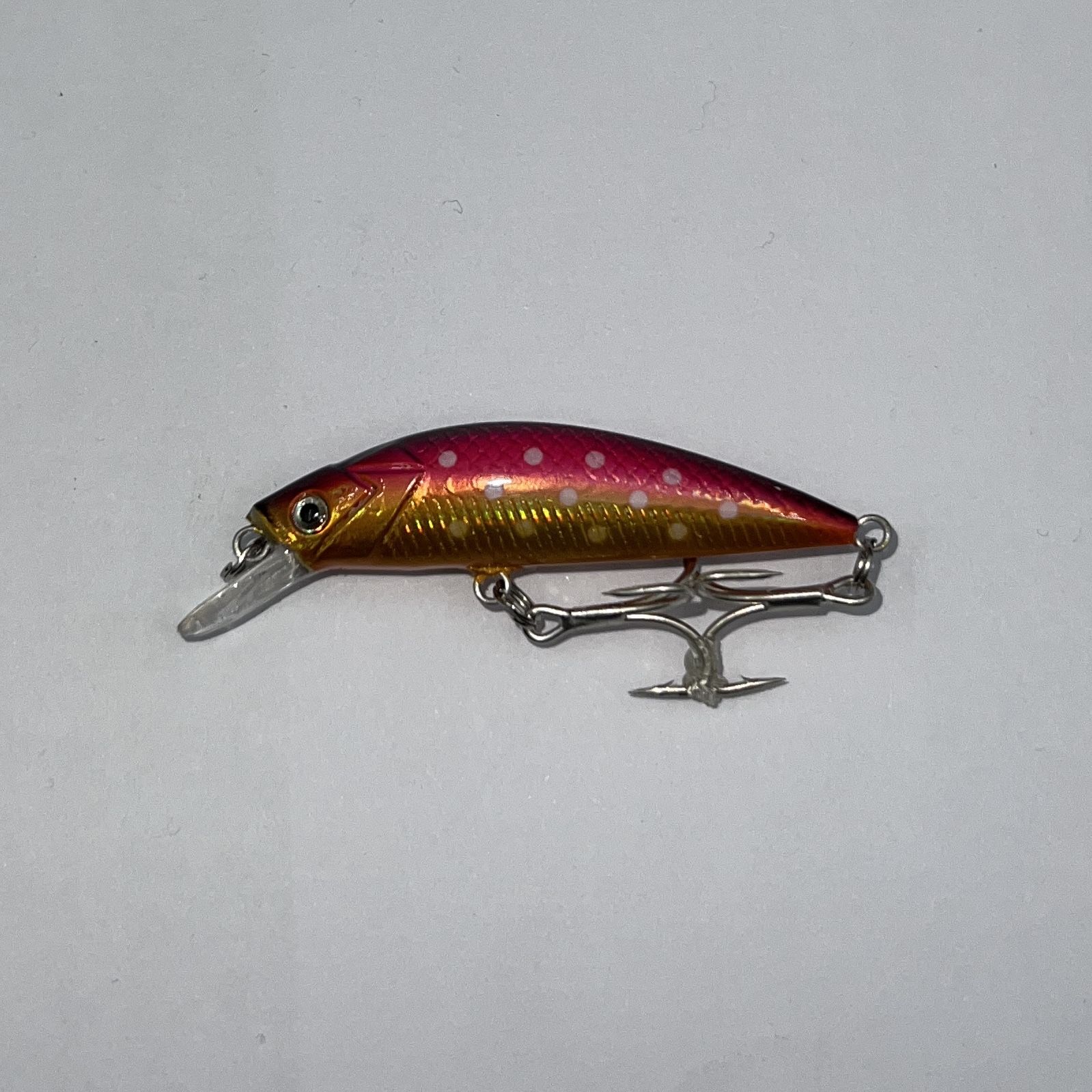 В данном воблере нам удалось объединить активную игру при равномерной проводке и достичь отличных лётных качеств за счёт существенного веса для своих небольших размеров. На верхней части воблера выполнена аппликация в виде чешуек, в нижней части в виде косых насечек. Головная часть имитирует жаберные крышки.