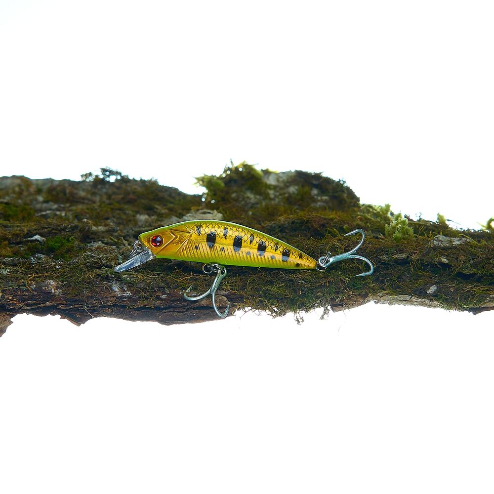 В данном воблере нам удалось объединить активную игру при равномерной проводке и достичь отличных лётных качеств за счёт существенного веса для своих небольших размеров. На верхней части воблера выполнена аппликация в виде чешуек, в нижней части в виде косых насечек. Головная часть имитирует жаберные крышки.