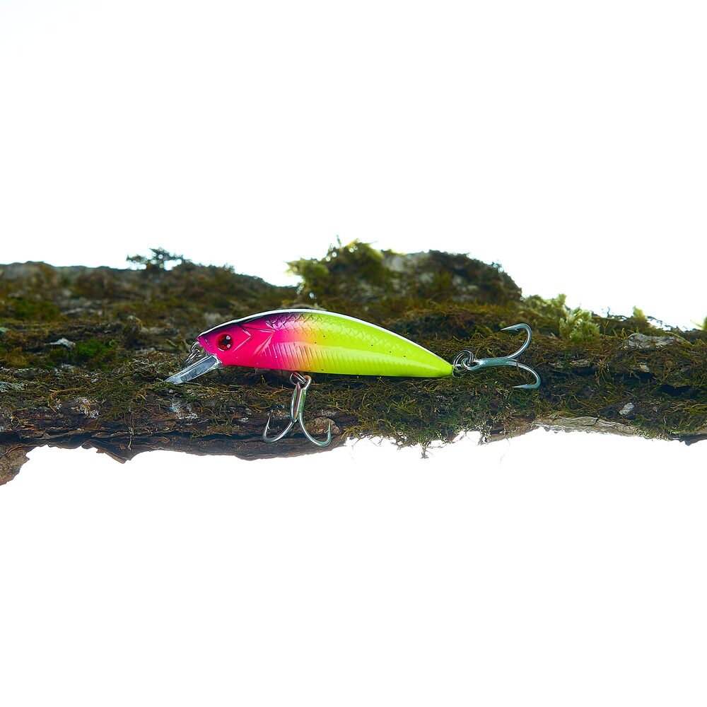 В данном воблере нам удалось объединить активную игру при равномерной проводке и достичь отличных лётных качеств за счёт существенного веса для своих небольших размеров. На верхней части воблера выполнена аппликация в виде чешуек, в нижней части в виде косых насечек. Головная часть имитирует жаберные крышки.