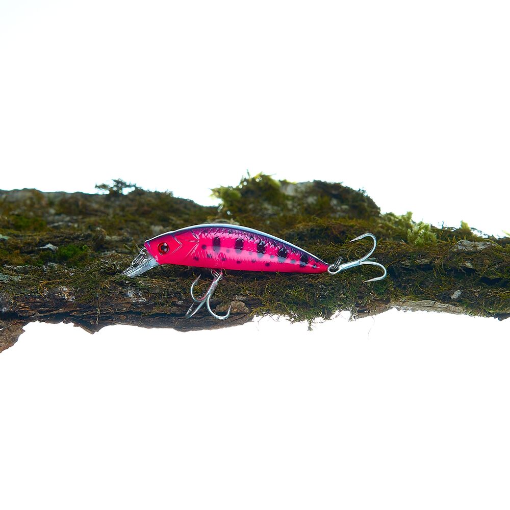 В данном воблере нам удалось объединить активную игру при равномерной проводке и достичь отличных лётных качеств за счёт существенного веса для своих небольших размеров. На верхней части воблера выполнена аппликация в виде чешуек, в нижней части в виде косых насечек. Головная часть имитирует жаберные крышки.