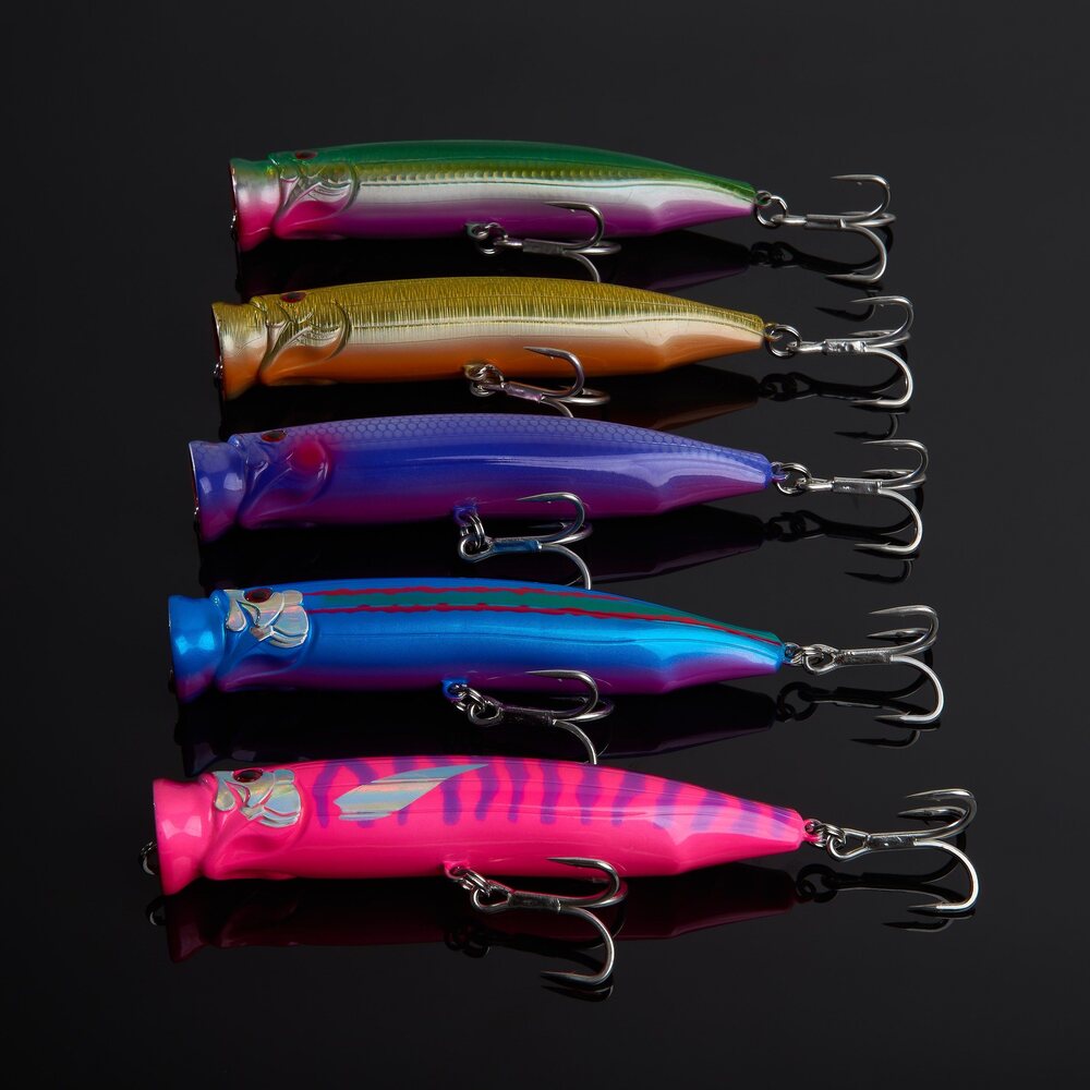 Наш поппер отлично плавает как при медленном вываживании, оставляя за собой длинные пузырьки, так и при более сильном вываживании с мощными рывками, создающими большие и громкие всплески воды.