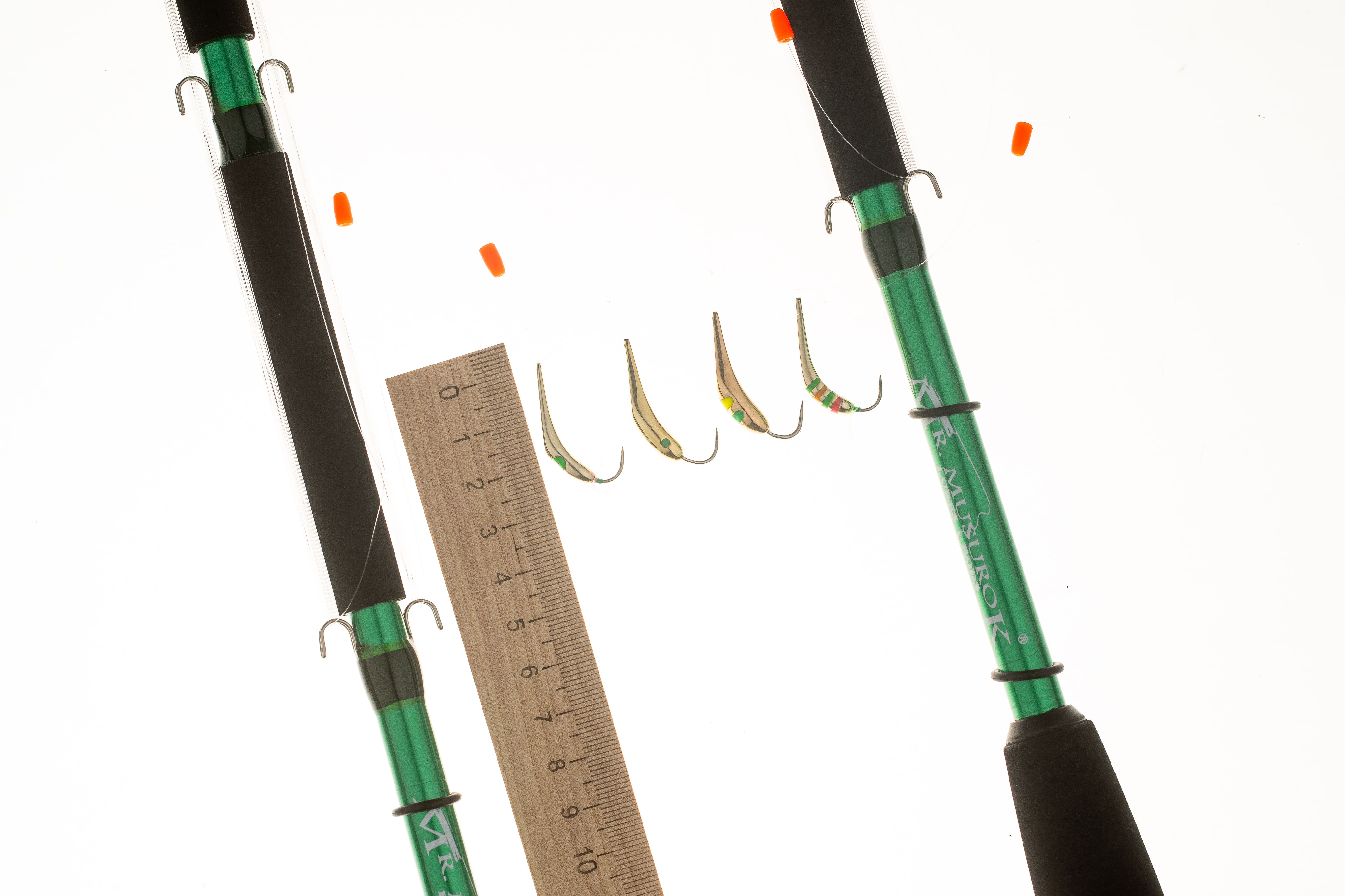 Между крючками для намотки лески расположенны специальные чёрные вставки из EVA, в которые можно втыкать блёсны. Так же махалки оснащены резинрвыми кольцами за которые так же удобно цеплять блёсны.